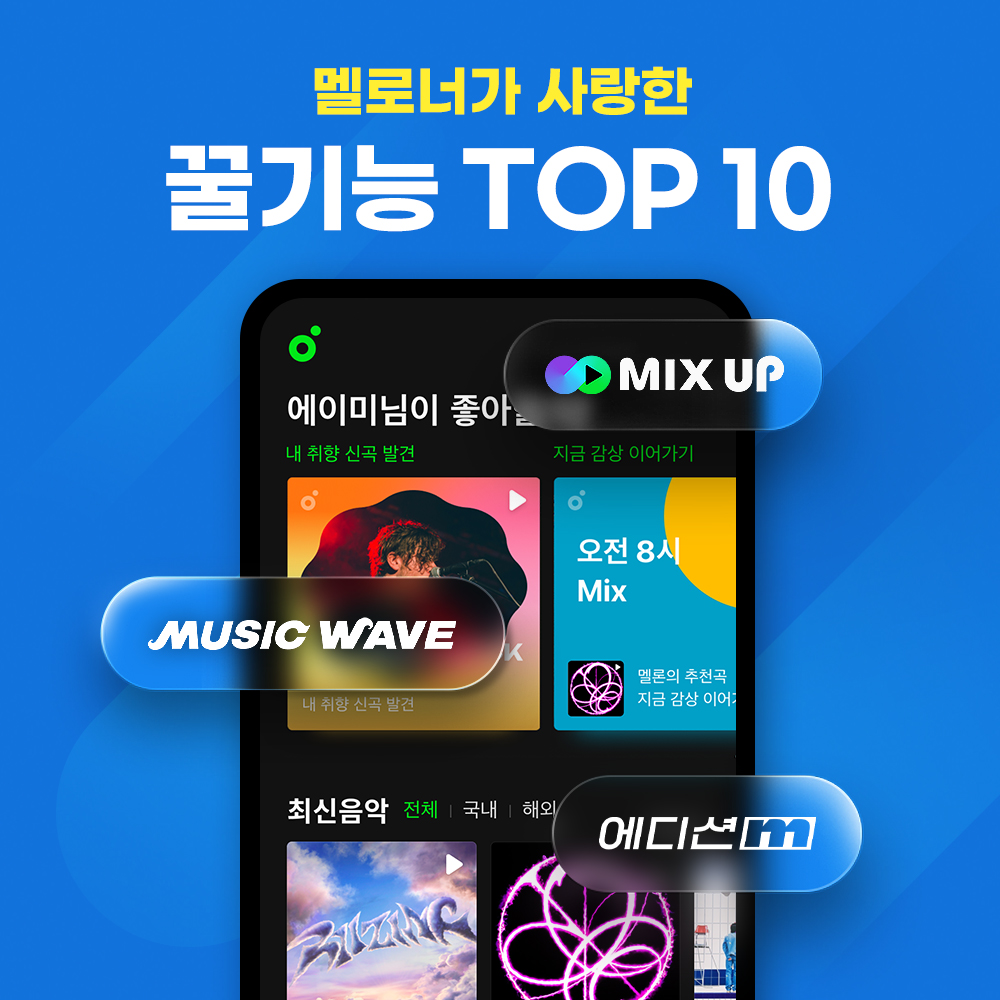 ‘멜로너가 사랑한 꿀기능 TOP10’에서 1위는 작년 9월 출시된 음악 자동추천 서비스 ▲‘믹스업(MIX UP)’이 차지했다. 전체 댓글 중 21%가 지목한 믹스업은 버튼 클릭 한 번 만으로 현재 듣고 있는 노래와 유사한 곡을 끊임없이 추천한다. 특히 기존 나의 재생목록과 별도로 플레이 되기 때문에 번거롭지 않고 간편하게 음악을 감상할 수 있다. 이용자들은 ‘취향에 맞는 노래를 쉽게 이어서 들을 수 있어 편리하다’, ‘내가 원하는 스타일의 곡만 쏙 넣어준다’, ‘띵곡 디깅에 도움된다’ 등의 호평을 남겼다.